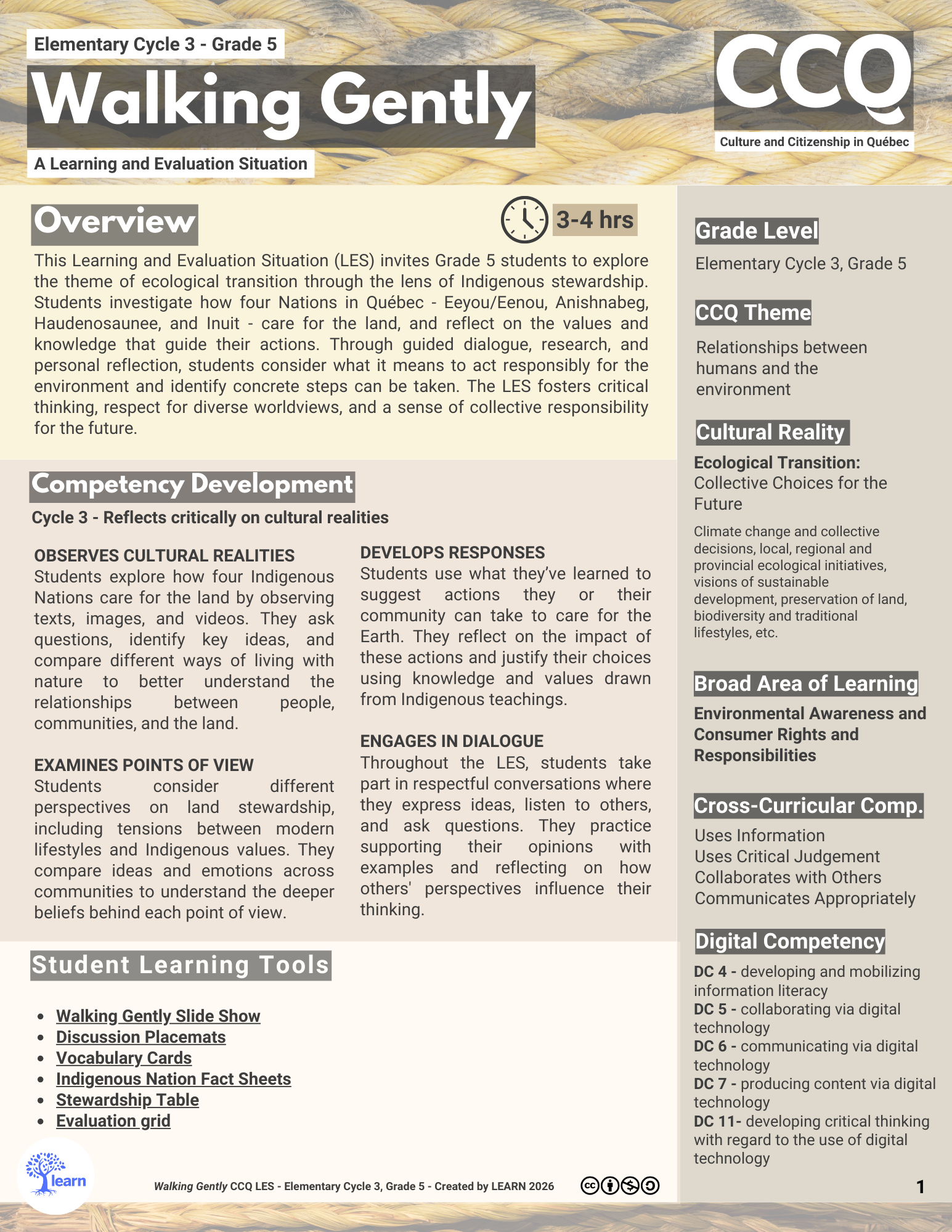 This Learning and Evaluation Situation (LES) invites Grade 5 students to explore the theme of ecological transition through the lens of Indigenous stewardship. The LES